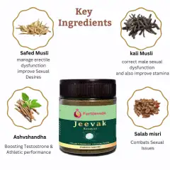 Kali Musli: Corrects male sexual dysfunction and enhances stamina. Safed Musli: Manages erectile dysfunction and boosts sexual desires. Salab Misri: Supports testosterone boosting and athletic performance. Ashwagandha: Enhances overall male health and combats sexual issues.