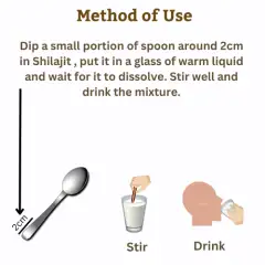 Dip a small portion of spoon around 2cm in Shilajit , put it in a glass of warm liquid and wait for it to dissolve. Stir well and drink the mixture.